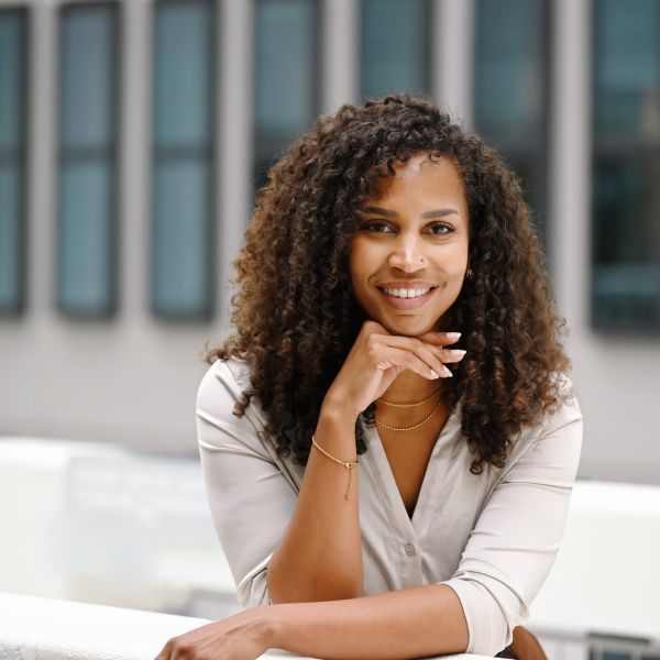 Maintain a natural and relaxed stance. Ensure your shoulders are back and down, your chin is slightly up, and your smile is genuine to convey approachability.